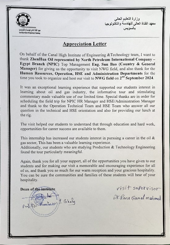 自2014年正式進(jìn)入埃及以來(lái),埃及NPIC公司積極履行社會(huì)責(zé)任,支持埃及當(dāng)?shù)亟逃聵I(yè)發(fā)展,已與多所埃及高校建立了合作關(guān)系,作為實(shí)習(xí)基地每年為當(dāng)?shù)卮髮W(xué)生提供了大量實(shí)習(xí)崗位,并以“1對(duì)1師帶徒”形式重點(diǎn)培養(yǎng)學(xué)生油氣開(kāi)發(fā)管理和現(xiàn)場(chǎng)實(shí)踐操作能力和經(jīng)驗(yàn)。10年來(lái),已累計(jì)為6所大學(xué)提供了800多個(gè)實(shí)習(xí)機(jī)會(huì)及就業(yè)崗位,獲得當(dāng)?shù)卣块T(mén)的高度稱贊,多次收到當(dāng)?shù)馗咝5母兄x信,展示了中資企業(yè)的良好形象,助力項(xiàng)目平穩(wěn)運(yùn)營(yíng)。